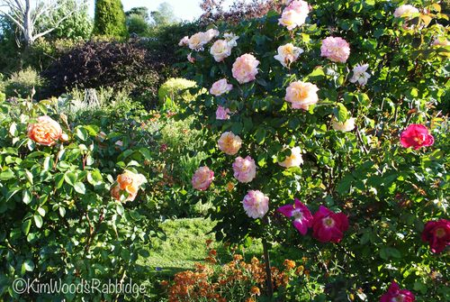 Glowing in the afternoon sun: an orange Pat Austin and ‘Blooming Miracle’ alongside the delicate but vivid David Austin ‘Red Coat’