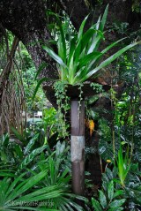 Another simple yet effective feature: along a pathway Mark’s installed several pedestals of interconnected pipes supporting a disk, in which he’s planted walking iris.